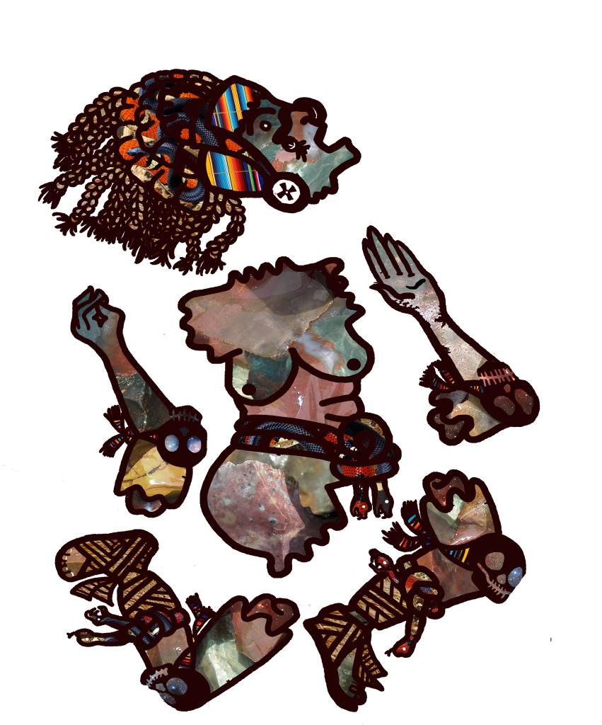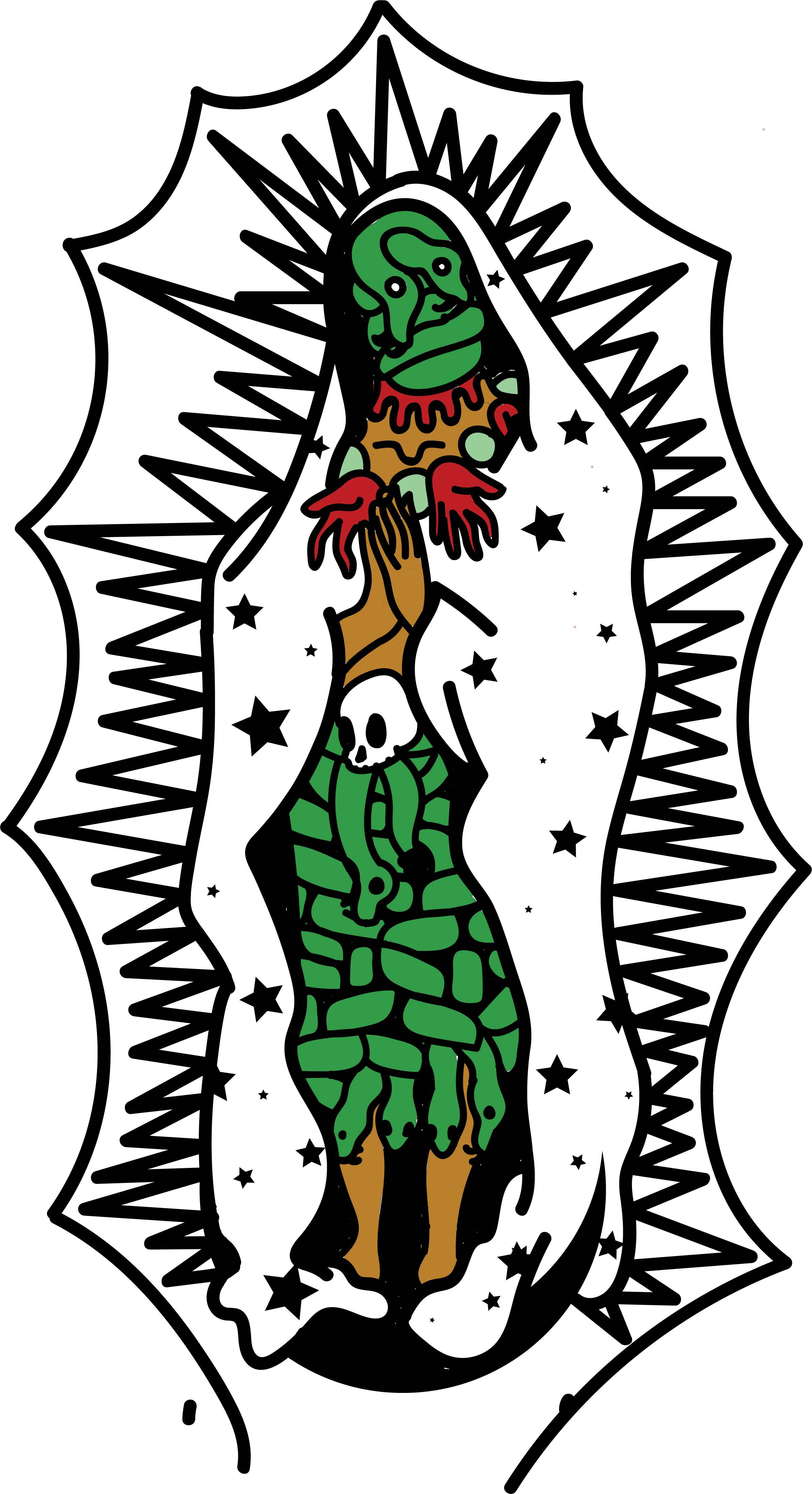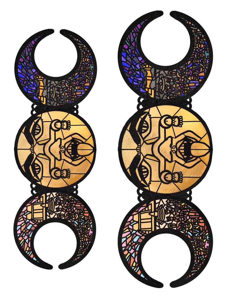 In Spring 2019, Female Divinities student Jessica Rodriguez created a final project inspired by Mexica imagery of Coatlicue and her daughter, Coyolxauhqui. She created two pieces of art based on their stories and one on the syncretism of Coatlicue with the Virgin of Guadalupe.